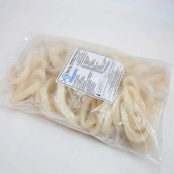 Lula Calamar cortada em anéis sem pele Congelado. Produto Importado do Chile, Argentina. Essas lulas são pre cozidas para amaciar a carne. Produto que não falta o ano inteiro e já tem um público fiel que prefere esta lula calamar com anéis gigantes se comparadas aos anéis da lula nacional grande.
